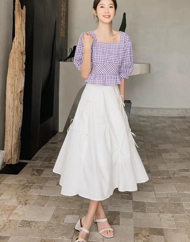又仙又温柔的一套look,上衣选择的是紫色大方领格子上衣,方领的衣服可以很好的突出好看的锁骨和优越的肩颈线条,显瘦显脸小,腰部是松紧腰带的设计,可以更好的贴合腰身,对身材要求也不高,大部分人都可以穿。下摆是有点类似荷叶边的设计,更加凸显腰身很显瘦,紫色真的太太太显白了,今年的流行色,不挑皮肤,黄黑皮也可以驾驭,不化妆也能白一个度。雪纺面料也比较适合夏天,穿着更舒服,很减龄的设计。裙子也是一眼就心动的款式,看到的时候脑海里就立马浮现干净,温柔,美好这些词。裙子上面还有蝴蝶结点缀,超级有少女心,增添可爱的感觉。整体A字的版型,可以遮挡臀胯,腿部缺点统统隐形,对身材的包容性很高,高腰设计视觉增高,拉长腿部线条,微胖的小仙女也可以这样穿,根本不用担心显胖的问题,这套搭配的重点就在于凸显腰身,所以重点都在腰上,可以完全忽略腿部问题,也压根看不到腿,只能看到锁骨,纤细的腰身和脚踝,所以是很适合腿部条件不好的仙女。脚踩高跟凉鞋,你就是夏日清凉又甜美温柔的小仙女,无论从哪个角度都看不出来胖或者腿不直,强烈推荐想要掩盖自己腿部问题的女生这样穿搭。就算不搭配高跟鞋,随意踩一双小白鞋或者帆布鞋都可以出门了,甜美少女感爆棚。