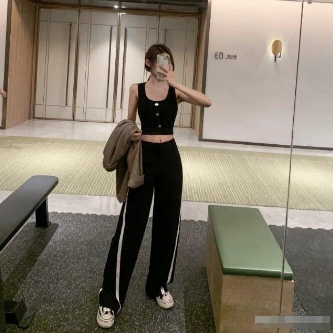女生夏天穿这样的背心又清凉又性感,身材好的妹子们很适合穿背心。搭配的黑色西装阔腿裤版型超A,即可以休闲帅气又可以遮肉显瘦。黑白撞色又不会觉得单调,高腰的设计可以提高腰线,拉长腿部线条,视觉显高。这种宽松的版型最修饰腿型了,不管是萝卜腿,大象腿还是O形腿等等都能轻松hold住,上身都是长直腿。西装面料垂感十足,看上去就自带高级感,随便搭配一件上衣就很有气质,我们衣柜里基础的T恤衬衫都可以搭配。脚踩一双老爹鞋,又飒又潮,不管什么身材,都能穿出纸片人的感觉,女生应该怎样搭配才能显得腿不弯?看上去一点也不觉得腿弯。