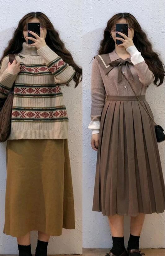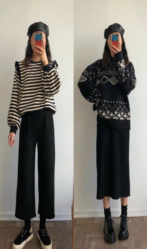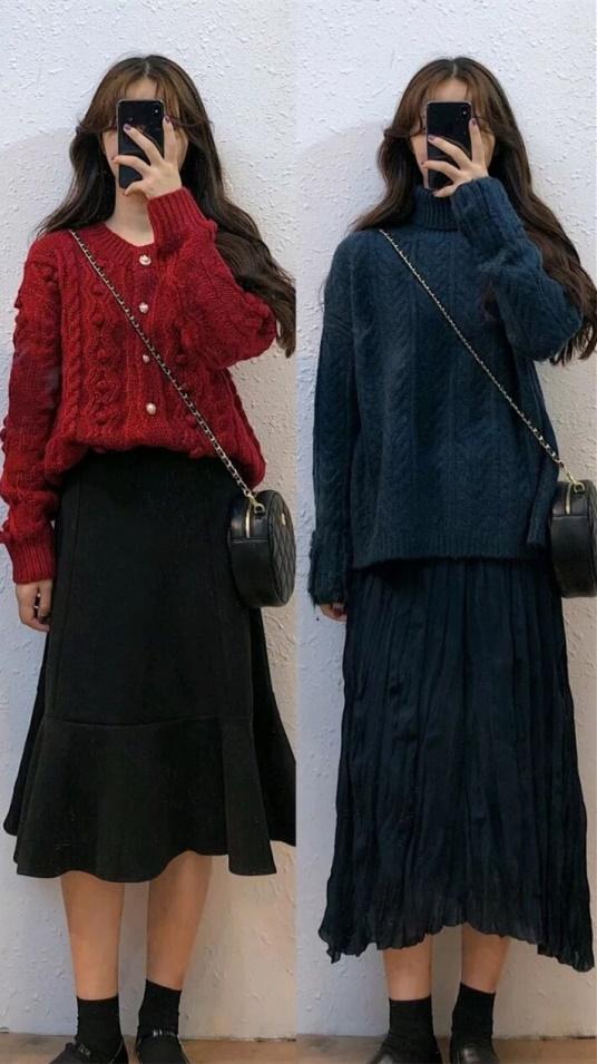 当然半身裙也不只有一种款式,一种颜色,秋冬季黑色,深棕色,咖啡色也可尝试。上衣搭配韩版条纹毛衣也是一个不错的搭配,宽松又优雅。若搭配同色系的翻领针织衬衫,学院风十足,穿上就是妥妥的的校园女神,帅气男生追着你要联系方式哦!