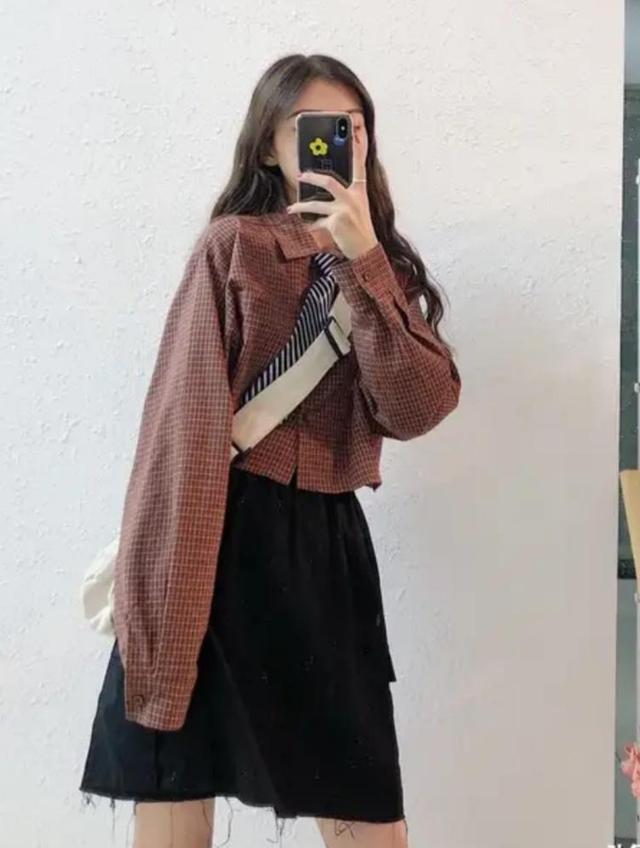 棉麻质地的外套一直以来都是大家非常喜欢的一件单品,因为他的质感非常好。今天我们要说的就是一件格纹图案的棉麻短外套,搭配一件黑色工装短裙。暗红色的格纹外套非常耐看,港风满满。黑色的裙子一点也不挑人,无论你是比较瘦妹子还是比较有肉的妹子都是可以轻松驾驭的。这一身可以搭配黑色的小皮鞋,也可以搭配白色的帆布鞋,可以根据自己的喜好来选择。