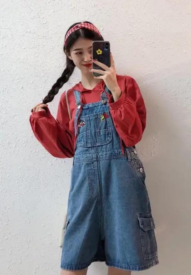 牛仔背带短裤和红色抽绳卫衣搭配在一起也会显得格外的可爱,非常适合还在上学的小可爱穿着。尤其是在裤子衣前的口袋上还有着非常可爱的刺绣,腰侧还有扣子的设计,不仅非常实用,而且还有装饰作用,减龄卖萌穿着一身最可爱了。红色的卫衣也是非常显瘦显白。头上可以配一条红色系的发带,可以和卫衣的颜色呼应一下。