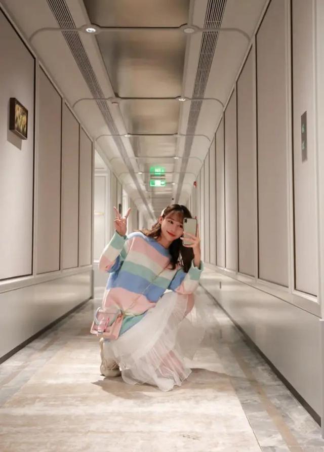 今年最火的风格是什么?泫雅风绝对榜上有名,接下来要介绍的这一身搭配就是非常典型的泫雅风,上身的毛衣是非常甜美的彩虹条纹套头毛衣,颜色非常清新,相对宽松的款式可以很好的遮挡身上的赘肉。下身搭配一件白色的网纱蛋糕裙,可以拉高我们的身线,让我们看起来更加苗条,这一身衣服真的是谁穿谁好看啊!