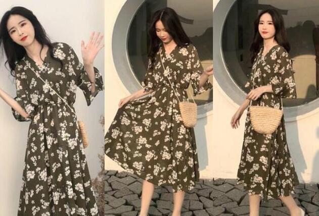 一袭清新颜色的复古v领碎花连衣裙,清新的颜色,不仅显甜美,更有种满满的少女范,深v领的设计,轻松拉长脖子线条,更能衬托出小脸,袖子处绑带设计,很好增添了美感,松紧收腰设计,穿上可显身材了,而且身材好的小可爱勇敢的驾驭起来,风格别致也十分前卫,脚下选择一双白色平底凉鞋搭配,气质、优雅、出街这样穿回头率100%!