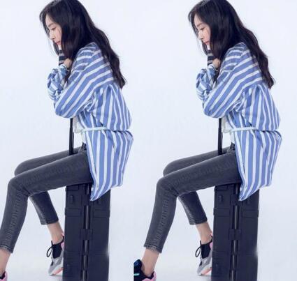另外蓝白竖条纹衬衣还可以当成小外套来穿,比如像杨幂一样,衬衣随意敞开,搭配紧身的牛仔裤,个性十足。