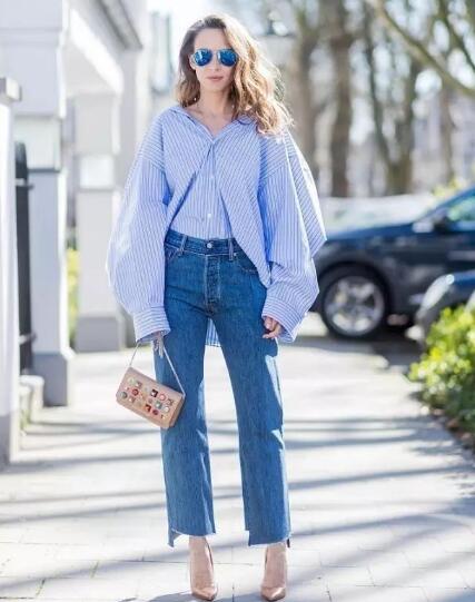 这几年oversized风盛行,宽松的蓝白竖条纹,V领的设计,搭配高腰的牛仔直筒裤,脚踩裸色高跟鞋,搭配屋,手拿镶嵌五彩石的小方包,走在街头,妥妥的回头率。