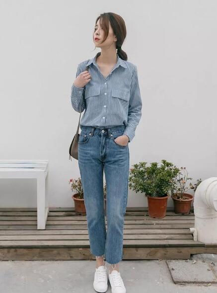 蓝白竖条纹衬衣最经典的搭配还是搭配牛仔裤,不规则的开叉裤脚跟蓝白竖条纹衬衣领口相呼应,搭配脏脏鞋,时髦有个性。