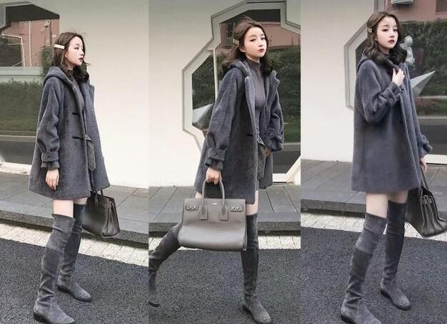 这款是灰色设计的过膝靴,靴子是丝绒的材质,收紧的版型是很舒适的,收紧的版型可以帮你解决影响整体搭配的问题,而且还不用担心会掉筒的担心,搭配灰色大衣,同样色系的搭配,看起来就很有高级感,小个子女生穿上还超显高挑,并且超时髦的。