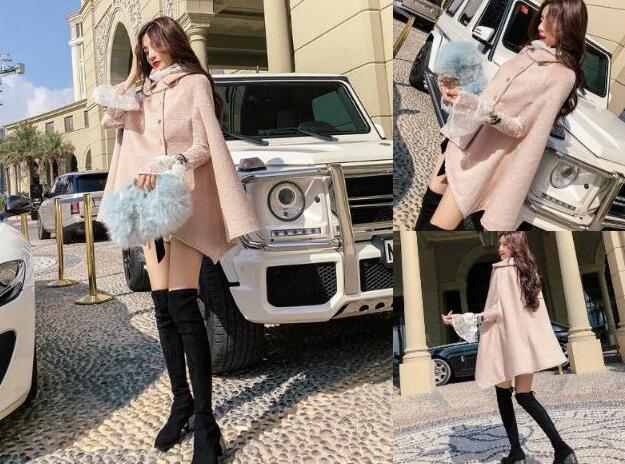 同样也是一双黑色的过膝靴,靴子还带有方跟的设计,这是小个子女生轻松显高的单品了,过膝靴搭配什么颜色大衣?并且过膝靴是好多小个子女生不敢穿的,怕显腿短,其实问题是你没有选对而已,对于小个子女生来说,一定要挑选收紧的版型,穿对了显长腿大气场都有了,搭配藕粉色大衣,是一款斗篷的设计,看起来就十分的有个性了,搭配起来显高又时髦。
