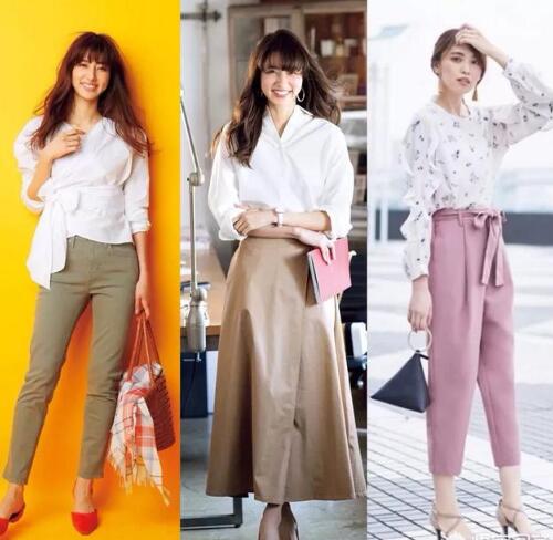 衬衫:衬衫的可塑性也极高,搭配牛仔裤是休闲的风格,搭配卡其色阔腿裤又会是舒适的通勤风,而与半身裙、高跟鞋搭配,再用精致的包袋做搭配,就变得很知性。经典的白衬衫+卡其色阔腿裤、半裙、浅粉色九分裤,都是很日常的穿搭。