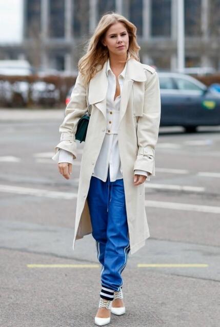 米白色的外套,给人一种十分温婉的感觉。外套怎么穿更有范?简约的蓝色运动裤,显得格外优雅。在米白色外套里面搭配白色单品,简单的颜色搭配,却显出了层次感。这时候选择绿色的包包,可以非常吸睛哦。