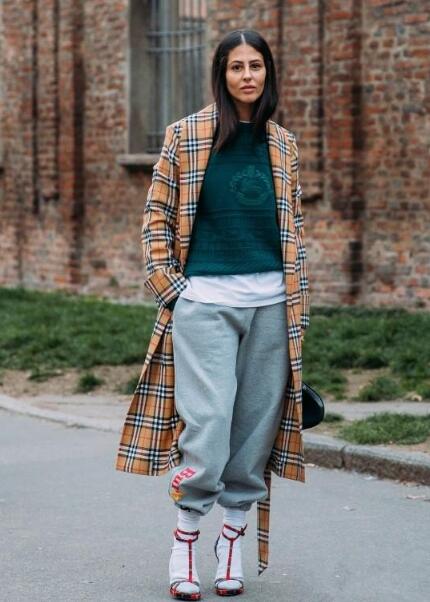 格纹外套,经典又复古,带着满满的文艺范。外套怎么穿更有范?遇见灰色的运动裤,在经典中加入些许运动休闲感,轻松打造休闲style。选择绿色的内搭,给整体look增添了一些沉稳感。露出的白色下摆,使整体的亮度提高了不少,穿衣技巧,也显得特别有层次感。脚踩红色的高跟鞋,显得特别高挑大方。如果小仙女怕冷,运动裤配什么外套好看可以选择一双袜子来hold住哦。