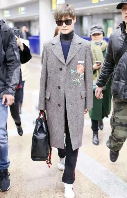 黑色的西装外套,简约的黑色运动裤,在颜色上显得格外简约,却散发着低调的优雅。选择浅蓝色的高领做内搭,分分钟使整体look提亮了不少。脚上穿的是黑色的帆布鞋,呼应外套和裤子的黑色,简约又接地气。