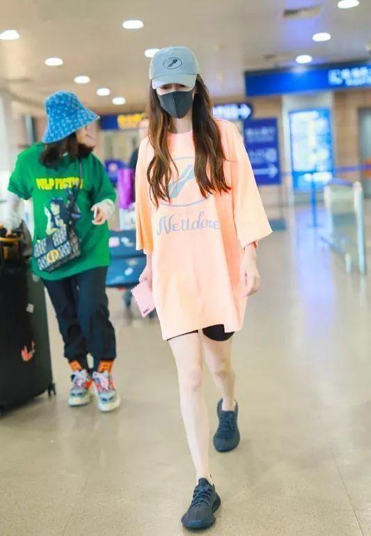 但橘T恤有些过长,盖住了身材的曲线,但即便是这种五头身比例。杨颖的一双美腿还是那么抢镜,刁钻的镜头下仍然是双筷子腿,这样的身材太另人羡慕了啊。但这也提了个醒,千万不要买太长的T恤。