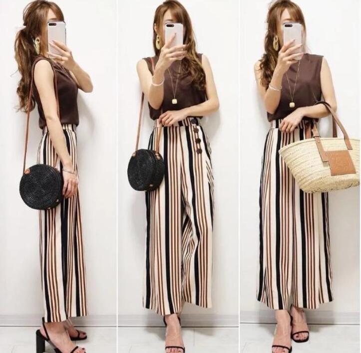 炎热的夏天,既不想露腿但又想要穿的清凉舒适,那么下装的选择尤为重要,首先是面料的选择,尽量选择轻薄透气的面料,其次版型上最好是宽松休闲的,想要满足这两点,空气裤是最不错的选择,就像这款高腰款式的条纹空气裤,不仅能够穿的清爽又舒适,同时又能够修饰腿型,隐藏大粗腿。上身搭配一件深咖色的小背心,脚上再搭配一双黑色一字带高跟鞋,整套搭配穿起来清凉舒适,同时又能够呈现几分气质优雅范。