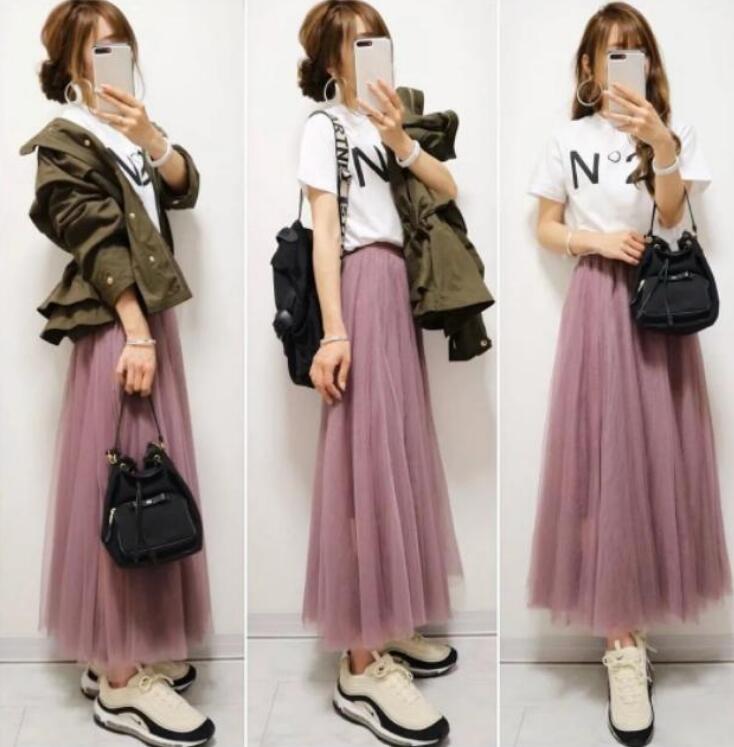 当然,想要不露腿,我们除了可以选择凉凉的空气裤,也可以选择半身裙哦,半身裙穿起来会更有女人味。也要记住,不要选择太过于贴身的款式,不仅显胖还容易闷热。像这款粉色的A字纱裙就很不错,穿上既能够修饰下半身,粉色的纱裙质地穿起来也会更加的甜美仙气,上身再简单的搭配一件白色字母T恤,就能够穿出清纯甜美又不失舒适范的感觉。