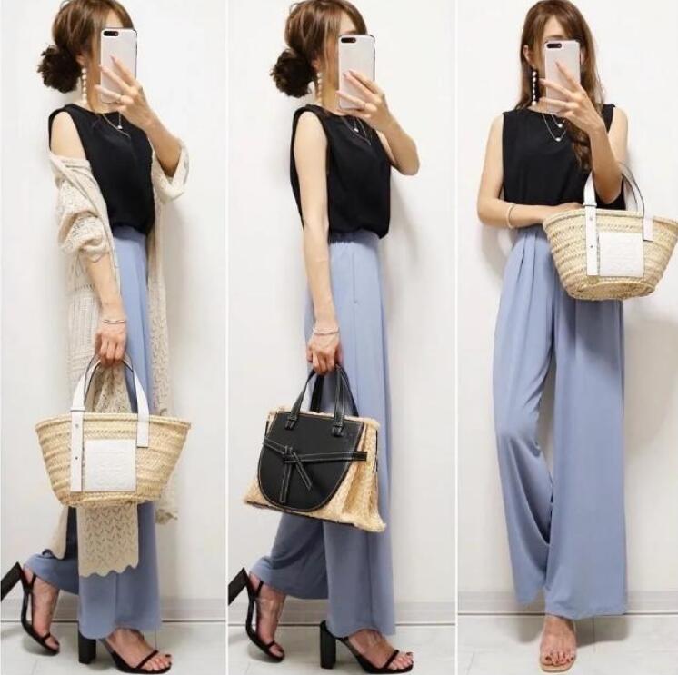 在这套穿搭中,仍然选择的是清凉又舒适的空气裤,浅蓝色看起来清新又养眼,面料舒适透气还特别有垂感,穿起来超显腿长。上身搭配了一件简单基础的黑色小背心,女生夏天穿搭不露腿整套搭配简约舒适又会显得高级大气。害怕晒黑的话,也可以在外面披上一件防晒衫,既能够起到很不错的防晒效果,整套Look也会显得更加的温柔知性。