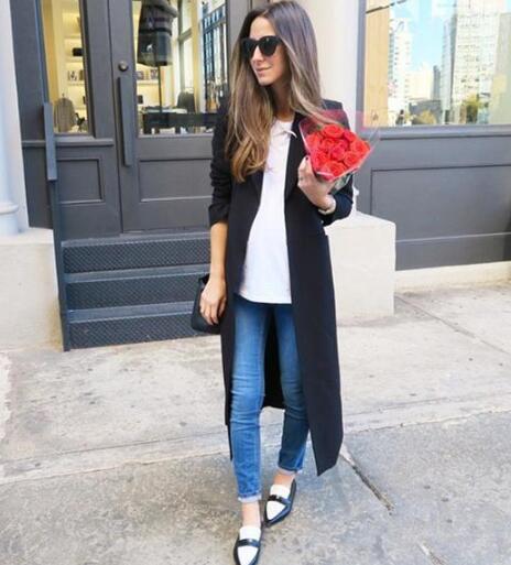 长款大衣除了可以搭靴子,配上乐福鞋会使小仙女显得格外秀气。大衣的黑色和鞋子边沿的黑色相呼应,非常有整体感,尽显优雅气质。选择一件白色单品来提升亮度,这样搭配,效果是不错的哟。下装get蓝色牛仔裤,在优雅中注入了清新活泼感,这样的穿搭小仙女们还喜欢吗?
