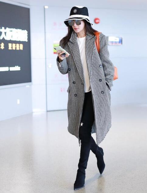 这款是黑色长靴,可以凸显小仙女修长的美腿,上身pick格纹大衣,复古又潮范。内搭白色单品,简约又显气质。pick时髦的帽子,这样搭配,不仅和裤子靴子的黑色相呼应,还显得非常优雅。