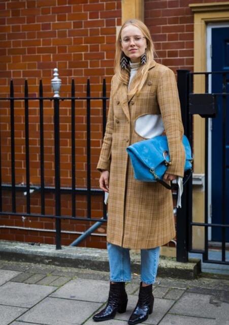 小仙女身穿蓝色牛仔裤,如果再get蓝色包包,尽显优雅气质,非常吸睛。pick格纹大衣,显得非常有韵味儿,带着复古范,也是很多小仙女喜欢的风格。脚踩黑色短靴,格外显气质,这个穿搭特别适合出门逛街呢。