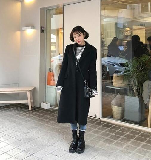 低调沉稳的黑,散发着优雅感。当保暖的黑色长款大衣遇见黑色靴子,帅气又有气质。内搭条纹的单品,经典又复古,给小仙女十足的文艺感。这款大衣的长度在膝盖以下,能给小仙女满满的温暖呢。