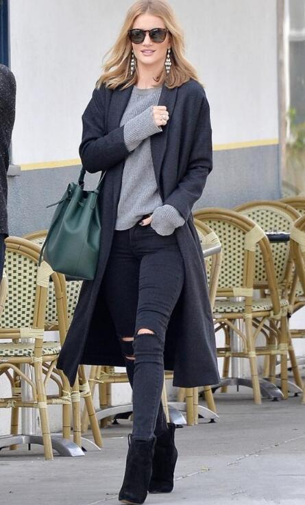 还是黑色靴子和黑色长款大衣,但是这款大衣设计得比较修身,可以把小仙女的美好身材展现得淋漓极致,尽显优雅气质。内搭灰色单品,散发着帅气的中性风,下装pick破洞裤子,这样搭配,非常有个性。把第三种颜色留给墨绿色的包包,全身颜色不超过3种,非常简约。