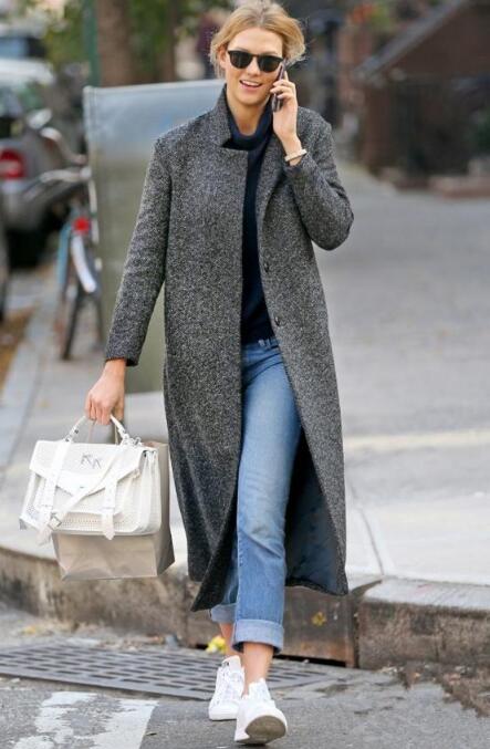 蓝色牛仔裤挺百搭的,配上保暖的灰色长款大衣,散发着妥妥的帅气感。脚踩小白鞋,清新又优雅。手提白色的包包,和鞋子同色,非常简约,又可以提升亮度哟。
