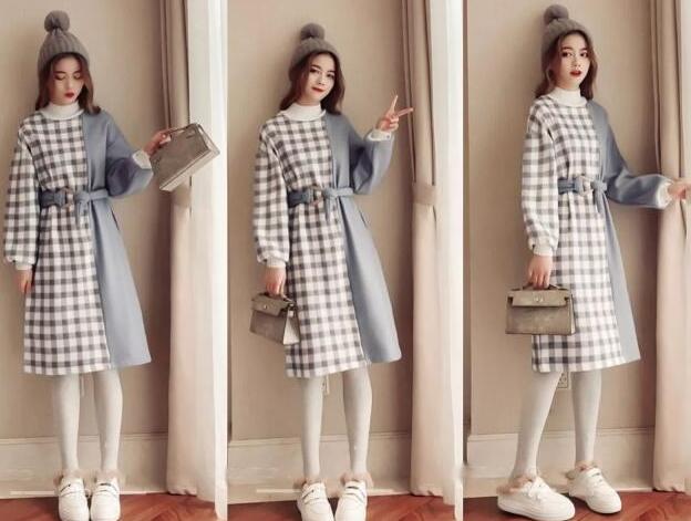 这款是很有个性的拼色连衣裙,左边是格子,右边是纯色系的颜色,整体穿上身就很有高级感的一款裙子,从视觉上又可以获得很美好的层次感,裙子的长度刚好在膝盖处,对于矮小个子女生来说,也是很友好的,搭配一条高腰带,显瘦又显身材,内搭一双米色打底袜,让你穿上温暖又好看,再外搭一双毛毛鞋,这款是白色的毛毛运动鞋,温暖又美丽。