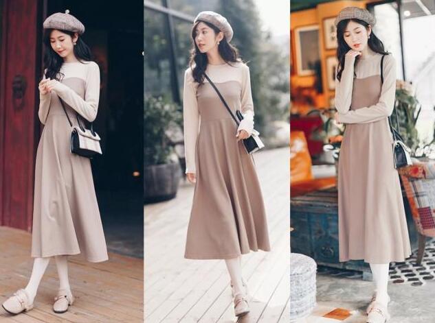 这款也是拼色设计的连衣裙款式,上半部分是简单的米色为色调的颜色,下半部分是杏色的连衣裙裙子,a字的版型又可以遮肉很显瘦,高腰的设计尽显你的高腰线吧,穿上就可以很显高挑身材的裙子,你穿上也是很好看的,搭配米色打底袜,袜子不仅可以让你获得温暖感,还可以让你获得更多的层次感,再外搭一双毛毛鞋,鞋子是平底的鞋跟设计,这样穿上就很温暖又美丽。
