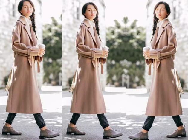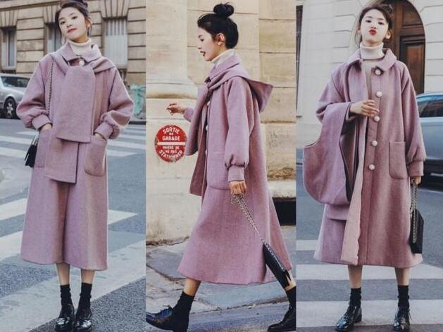 对于微胖的女生来说,这款宽松版型的大衣,再适合你不过的了,整体都是很宽大的设计,所以轻松显瘦遮肉的了,为你解决了一个大大的烦恼,而翻领的设计,经典又时尚,还可以修饰脸型,这款是配有围巾的设计,而围巾还是连帽子的哦,戴上的话,不仅可以保暖,还可以充当装饰的作用,让你造型更时髦,配上淡淡的粉色,更显嫩更美了,最方便的穿法就是内搭毛衣裙,再搭配黑色的乐福鞋,真心美。