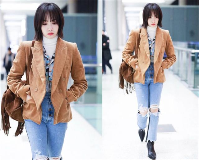 我们日常可以选择一件廓型的西装外套,修饰我们的身材,显得整体精神有活力,再内搭一件小高领衫,优雅时髦,像宋茜这样搭配一件破洞牛仔裤,很适合出去喝个下午茶呢。