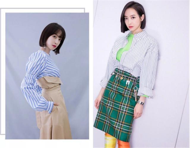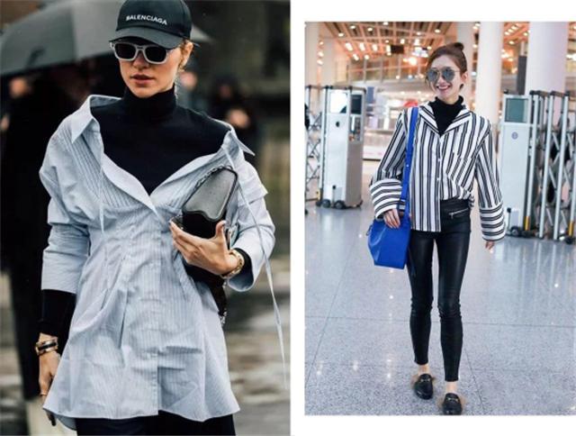 经典的条纹衬衣是最受欢迎的秋季单品,不过由于条纹元素很容易造成视觉疲劳,看起来有些许严谨,所以我们可以大胆的尝试用一些高调的小高领来搭配它。大开领的条纹衬衫搭配一件黑色的小高领,轻松演绎出轻熟的性感魅力,如果害怕整体的穿搭太单调,可以巧妙的运用一个亮色系的小单品来衬托它,比如像江疏影这样选择一只靛蓝色的大包包。