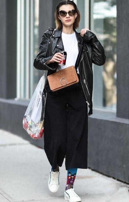 黑色是最显瘦最百搭的,这是毋庸置疑的。当黑色阔腿裤,遇上干净小白鞋,率性大方又有范,凸显时尚气场!选择白色短T,以及黑色皮夹克,帅气中带有一丝小清新气息,很是撩人!黑色阔腿裤的九分长度,露出印有图案的彩色袜子,更添一丝活力与俏皮,元气满满!