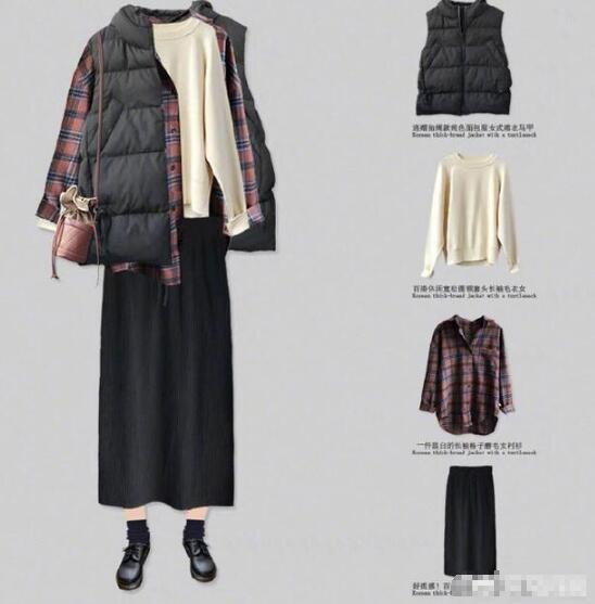 精致的叠穿更显穿搭品味,米色毛衣搭配格纹衬衣,外搭黑色羽绒马甲,下装选择搭配黑色的半裙,搭配小皮鞋,时髦保暖又有复古气息。冬天怎么搭配时尚不臃肿?