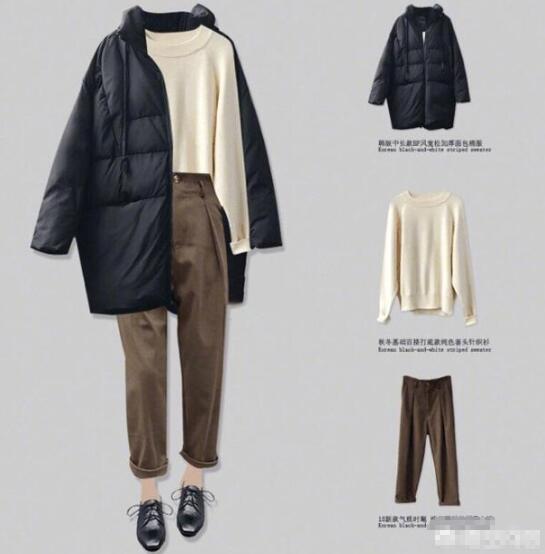 很多人觉得羽绒服比较土气,但其实羽绒服搭配的好一样可以穿出气质感,米黄色的毛衣搭配驼色的工装裤,外套黑色羽绒服,内浅外深的配色,提亮肤色又时髦。