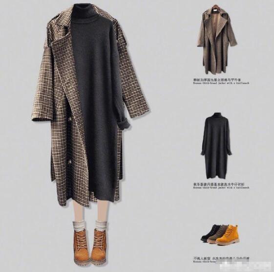 毛衣是秋冬季节必备的流行单品,黑色高领针织连衣裙,搭配格纹大衣,棕色的裸靴配上堆堆袜,帅气可爱的英伦风,尽显活泼气氛。