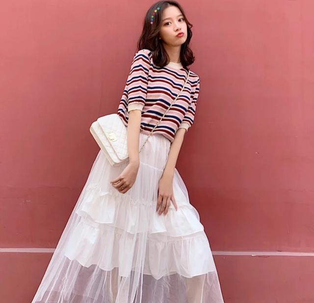蛋糕裙在今年格外火爆,它也有很多不同的款式,长款多褶蛋糕裙或者是短款蛋糕裙,和短袖都很百搭。彩虹条纹短袖加上仙气十足的白色纱网蛋糕裙,看起来时髦又干净,整体的搭配毫无违和感,走在人群里一眼就能发现这种闪闪发光的存在。这种网纱状的白色蛋糕裙很有设计感,虽然整体的裙身很蓬松,但上身不会显胯宽屁股大,喜欢穿蛋糕裙的小仙女一定要挑好版型!