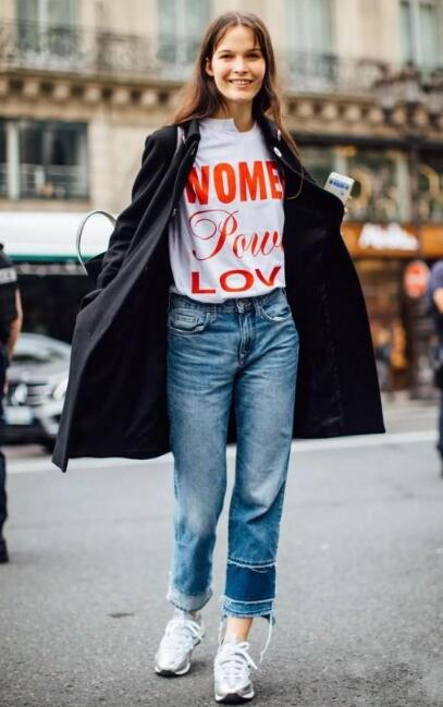 秋冬pick黑色外套,低调又有气质。配上小白鞋,增加了不少活泼感。外套里面内搭带字母的白色单品,提高了上身的亮度,也显得更加有生趣。下身选择蓝色牛仔裤,格外简约。把内搭的下摆塞进裤子里,收高了小仙女的腰线,显得更加高挑,你学会了吗?