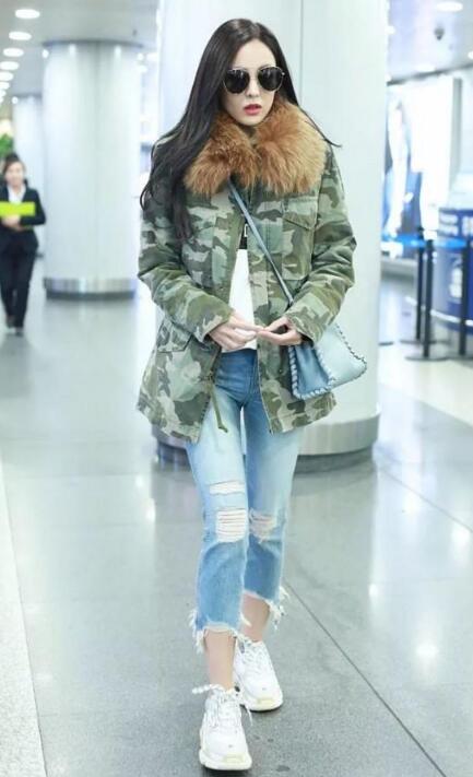 迷彩外套,显得特别有个性,带毛的设计保暖舒适有活力。脚踩小白鞋,整个look显得更加轻盈有活力。下身get破洞牛仔裤,彰显着满满的个性感,选择浅蓝色的斜挎包,穿小白鞋配什么外套?为小仙女增加了俏皮感。pick黑色的墨镜,给小仙女增加了不少神秘感哦。