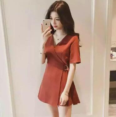 这种橙红色,会显得皮肤超级有气色,十分出挑。绸缎面料,光泽度非常好,使衣服显得十分高级有质感。V领设计,可以露出锁骨,性感迷人。收腰绑带设计,独特又显瘦,加上A字裙摆,满满的熟女风。