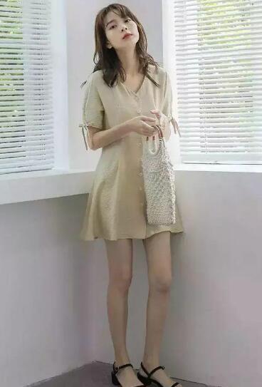 这款裙子对平胸妹子超级友好,穿上去满满的性冷淡风,秒变超模。大面积的杏色铺垫,显得温柔十足。用白色纽扣和袖口绑带点缀,使裙子更加有设计感,俏皮可爱。超短裙摆,轻松秀出大长腿。搭配黑色凉鞋,十足的复古女郎。