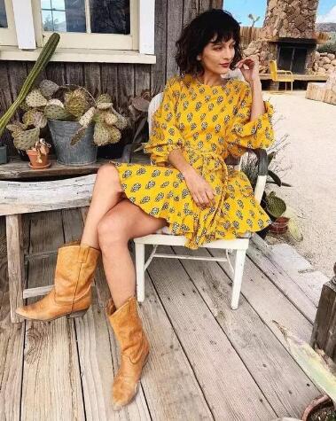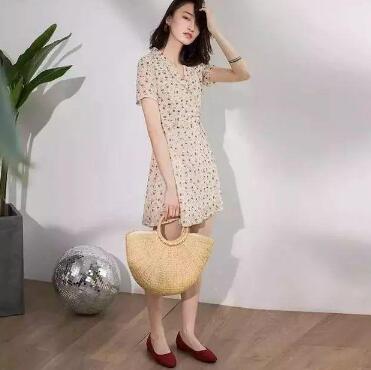 这款碎花裙就更加适合上班族的妹子,有股成熟稳重的味道在里面。姜黄色和白色的碰撞,亮眼又独特,满满的夏日活力。白色卡通小花图案,使得裙子在成熟中带了一点俏皮,让人惊喜。五分袖的设计再加上泡泡袖,独特而复古。