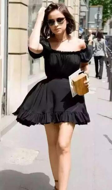 不知道穿什么颜色好,黑色一定是个很好的选择,不容易出错。领口独特的收紧胜设计,一件裙子秒变两件,既能当方领裙穿,搭配屋,复古风满满,又能当一字肩穿,性感迷人。收紧腰部,打造迷人线条,加上低调神秘的黑色,满满的高冷感。