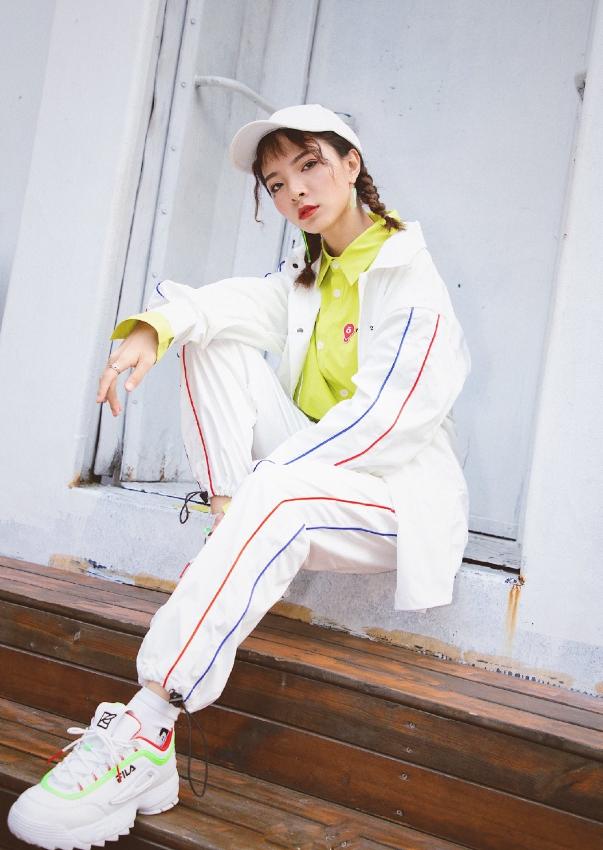 衣服的样式是很普通的运动装和棒球帽的搭配,大面积的白色,很亮眼的颜色,但是营造酷酷的感觉的还是线条和荧光色的作用,衣服上以简单的蓝红线条为主,虽然简单,但是有些很强的流线感和运动感。再搭配上荧光黄色的衬衫作为内衬,整个人看起来就非常的亮眼。