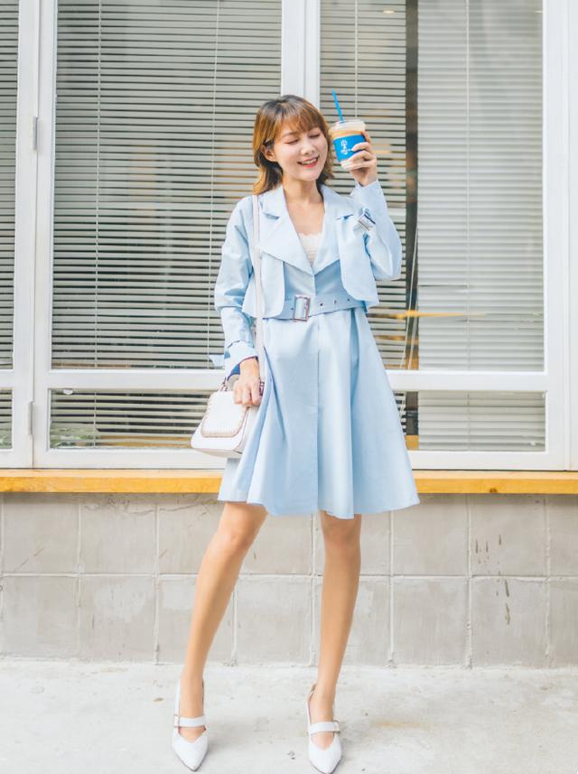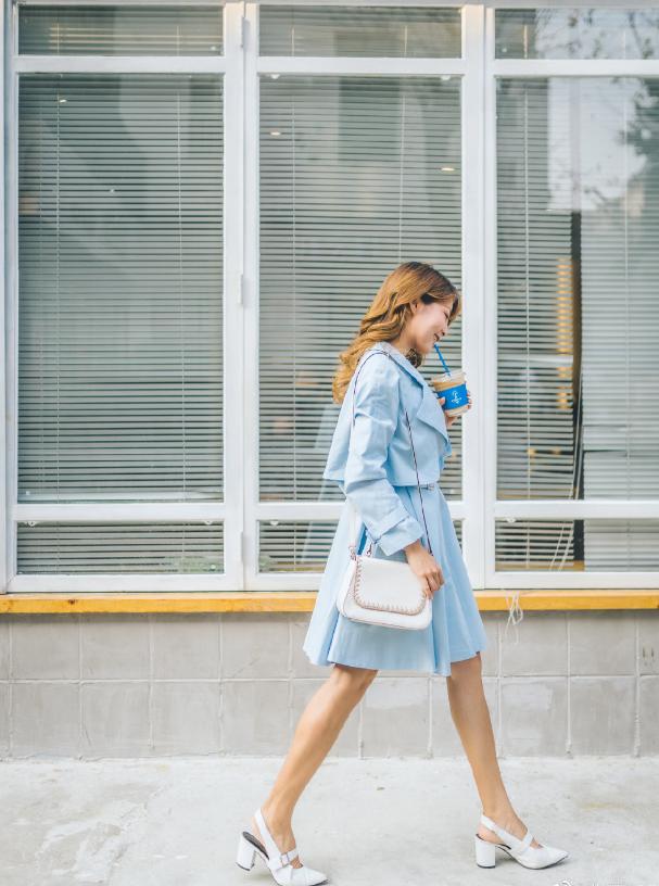 蓝白搭配看起来就是非常清凉的,而且是很温和舒适的一种色彩搭配。蓝色的风衣,在视觉上给人一种很清凉的感觉,但是又保证了自身的温暖。搭配上白色的高跟鞋和白色包包,就给人一种很温柔的感觉。非常适合气质温柔的小仙女们。