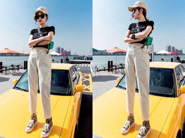 2、米白色可以说是今年最流行的一种裤子颜色了,两边的口袋是侧着的设计,所以无论是装饰还是使用上都起到了实用的效果,同样是九分的长度,所以即便是矮小个子也可以轻松驾驭,搭配豹纹帆布鞋,这样搭很好看。