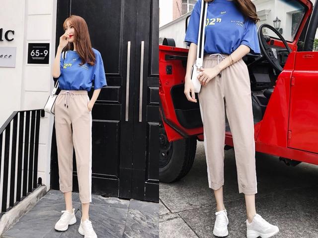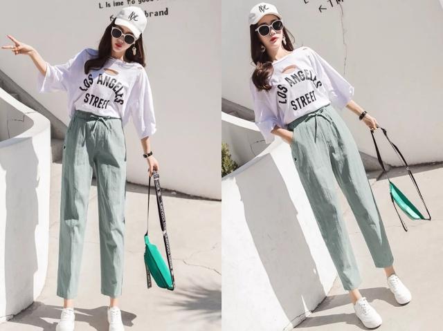 1、这款是属于带有一点点绿色的休闲裤,裤子是绑带裤头的设计,所以随便调节就可以让你的腰身看起来很显瘦,裤子是属于萝卜裤的设计,对于大腿比较粗的女生穿最适合了,搭配小白鞋真的很好看!