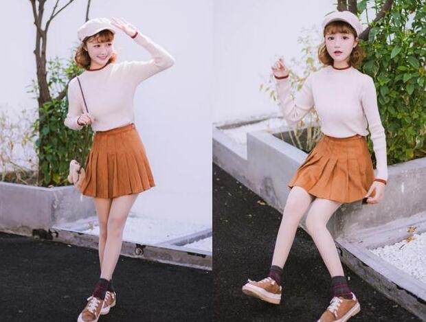 显气质的米白色毛衣,温柔又迷人,搭配高腰设计的百褶短裙,尽显青春的味道,优雅又迷人,焦糖色的短裙和米白色都属于同色系的搭配,视觉上就很显高挑身材的哦。