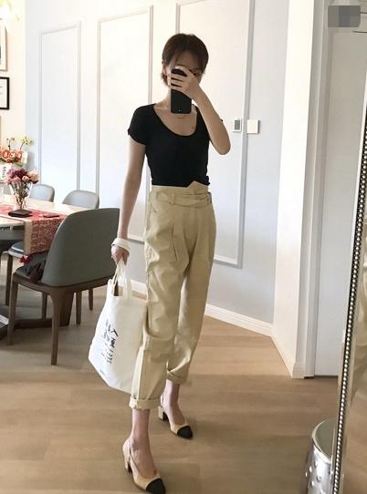 黑色和米色真的是比较经典的一种色彩搭配之一了,也是香奈儿最经典的配色呢。简单的黑色基础款T恤不管怎么穿都是超级显瘦的,大大的圆脸有一点小性感但是也不会过分暴露。配上一条非常有质感的高腰哈伦裤,裤腿卷到七分的长度,显瘦显高又能觉得高级。