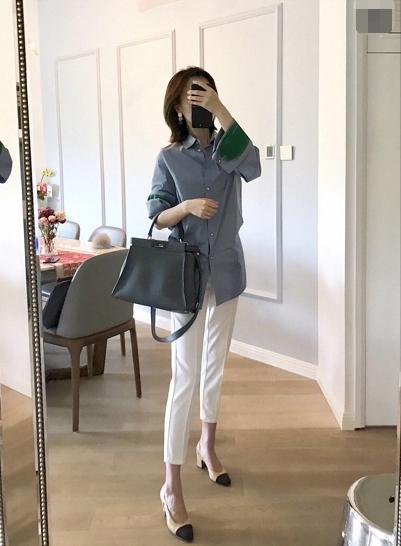 让人觉得很干练的女强人既视感,上身的衬衫可以说设计感真的非常强烈了,乍一眼看上去可能是平淡无奇的,但还是比较具有时尚特色的。大大的袖口有撞色的晕染,将一件原本普通的衬衫马上就变得有趣起来了。下身配一条比较修身的白色七分裤,气场十足!