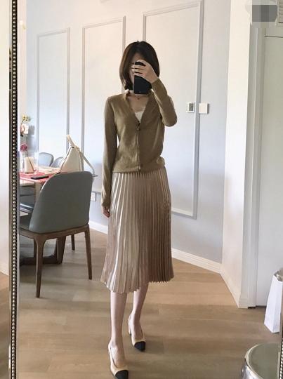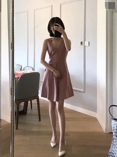 这一身就会比较少女气息一些了,看上去会比较乖巧甜美,V领可以起到修饰脸型的效果,拉长和修饰颈部耳朵线条,凸显锁骨的美感。下身则又是A字裙蓬蓬的款式,有点俏皮可爱的小女人气息,豆沙粉也是非常温柔的一款颜色哦。